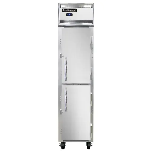 Introducing the Continental Refrigerator, 1RSENSAHD, Reach-In Refrigerator, designed to simplify restaurant operations. This slim line refrigerator is perfect for commercial restaurant use, offering a space-saving solution without compromising on performance. With its one-section design and standard depth, it provides ample storage space for your ingredients and beverages. The aluminum interior ensures durability and easy cleaning, while the stainless steel exterior adds a sleek and professional look to your kitchen. The half-height solid doors allow for easy access to your stored items, while the electronic control with a digital display ensures precise temperature management. The hi-low alarm alerts you to any temperature fluctuations, ensuring the freshness and safety of your food. Made in the USA and certified by cETLus and NSF, this Continental Refrigerator is a reliable and efficient choice for any commercial kitchen. Simplify your restaurant operations with this high-quality reach-in refrigerator.