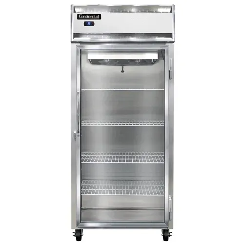 Experience kitchen innovation with the Continental Refrigerator 1RXNGD Reach-In Refrigerator. This extra-wide, one-section refrigerator is designed to meet the demands of a commercial restaurant. With its aluminum exterior and interior, as well as a stainless steel front, this refrigerator is built to withstand the rigors of a busy kitchen. The full-height glass door not only adds a touch of elegance but also allows for easy visibility of the contents inside. The electronic control with a digital display ensures precise temperature control, while the hi-low alarm alerts you if the temperature deviates from the set range. The electric condensate evaporator eliminates the need for manual defrosting, saving you time and effort. With a 1/3 HP compressor, this refrigerator provides efficient cooling for your ingredients and perishables. Made in the USA and certified by cETLus and NSF, the Continental Refrigerator 1RXNGD is a reliable and high-quality choice for any commercial kitchen.