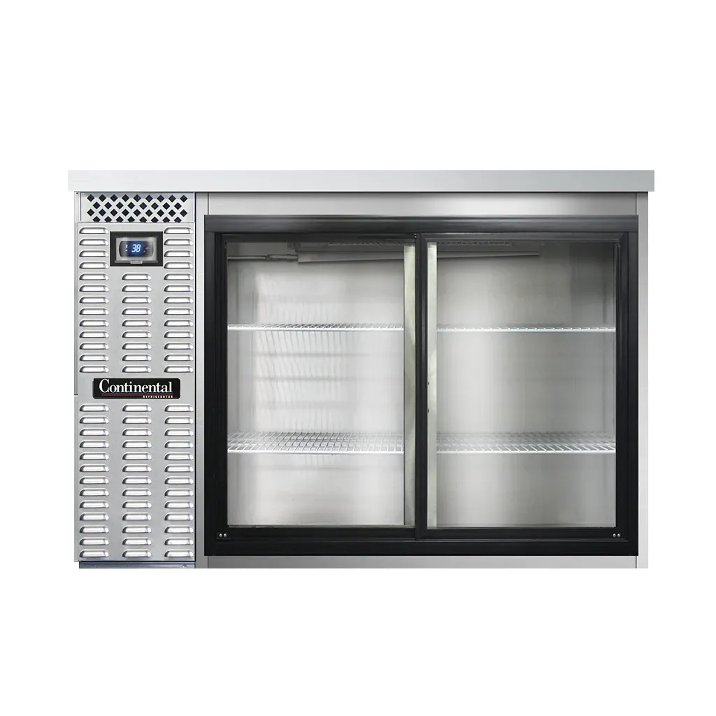Boost your restaurant's performance with the Continental Refrigerator BB50SNSSGD Back Bar Cabinet. This refrigerated unit is designed to meet the needs of busy commercial kitchens. With a shallow depth of 50"W and a height of 34-3/4"H, it provides ample storage space without taking up too much room. The 13.0 cubic feet capacity allows you to store a variety of beverages and ingredients, keeping them at the perfect temperature for serving. The front breathing design ensures efficient operation, while the stainless steel exterior and galvanized interior with a reinforced stainless steel floor guarantee durability and easy cleaning. The two glass doors come with locks for added security. The electronic controller with a digital display and hi-low alarm allows for precise temperature control and monitoring. With its self-contained refrigeration system and 1/3 HP compressor, this back bar cabinet is both energy-efficient and reliable. Made in the USA and certified by cETLus and NSF, this Continental Refrigerator unit is a must-have for any commercial restaurant.
