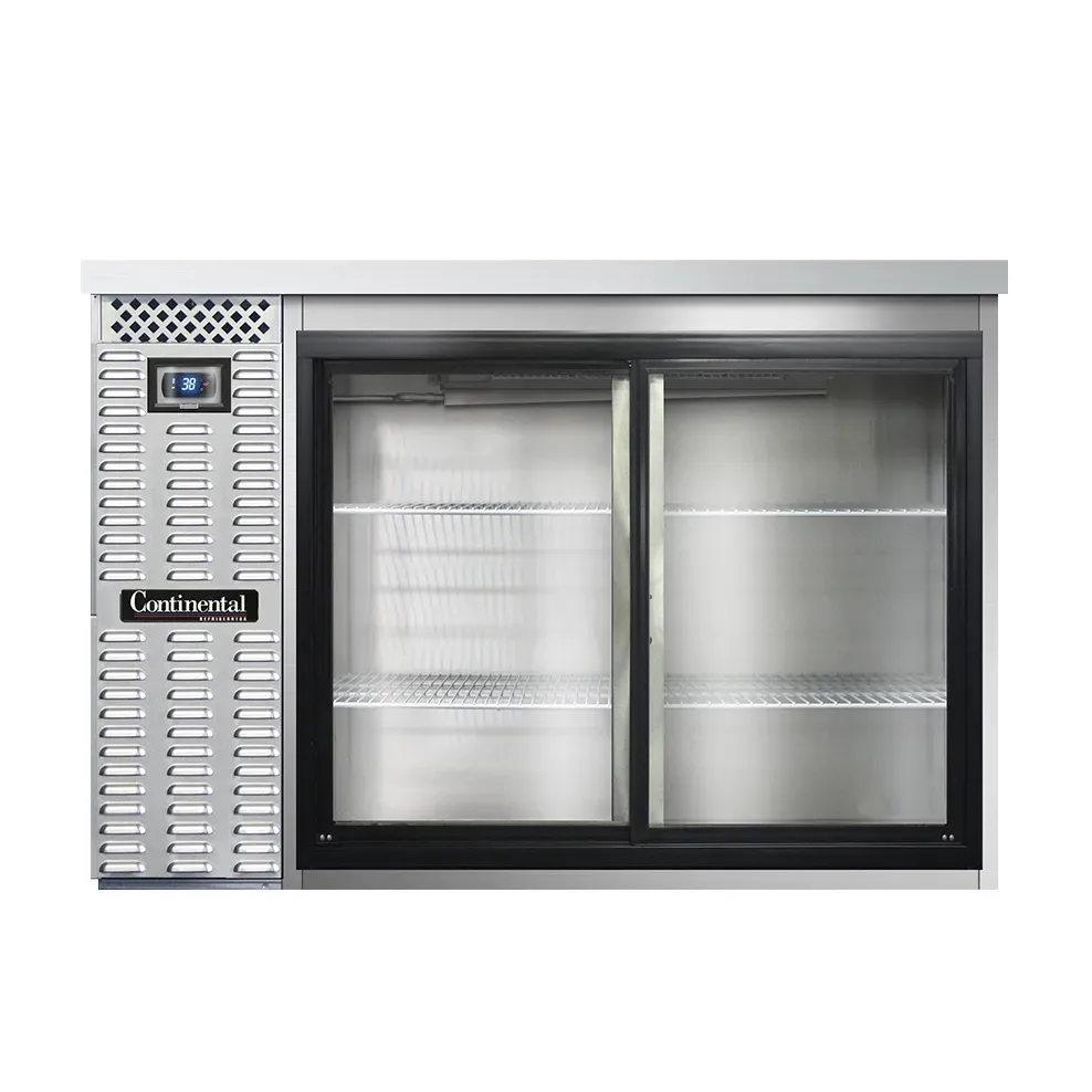 Fuel your passion for cooking with the Continental Refrigerator BB50SNSSSGD Back Bar Cabinet. This refrigerated unit is perfect for commercial restaurant use, offering a shallow depth design that maximizes space efficiency. With a generous 13.0 cubic feet capacity, you'll have plenty of room to store and display your beverages and ingredients. The front breathing feature allows for easy installation, while the sliding glass doors provide convenient access to your products. The electronic controller with a digital display and hi-low alarm ensures precise temperature control and monitoring, keeping your items at the perfect temperature. Made in the USA, this back bar cabinet features a stainless steel exterior and a galvanized interior with a reinforced stainless steel floor, ensuring durability and longevity. The epoxy coated steel shelves are adjustable, allowing you to customize the storage space to suit your needs. Trust Continental Refrigerator for reliable and high-quality refrigeration solutions for your commercial kitchen.