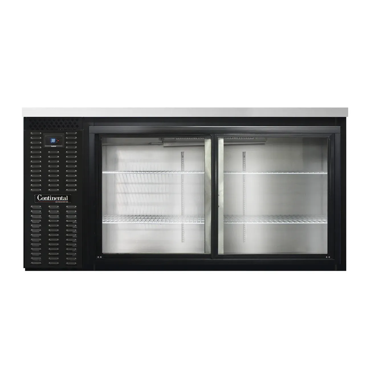 Elevate your culinary experience with the Continental Refrigerator BB69SNGD Back Bar Cabinet. This refrigerated unit is designed specifically for commercial restaurant use, offering a shallow depth of 69" and a stainless steel top for durability and easy cleaning. The 18.0 cubic feet of storage space is perfect for keeping beverages and ingredients chilled and easily accessible. The front breathing design allows for flexible installation options, while the two glass doors with locks provide both visibility and security. The electronic controller with digital display and hi-low alarm ensures precise temperature control and monitoring. With a black enamel finish exterior and a galvanized interior with a reinforced stainless steel floor, this back bar cabinet is built to withstand the demands of a busy restaurant environment. The epoxy coated steel shelves are adjustable to accommodate different bottle sizes and can be easily cleaned. Made in the USA and certified by cETLus and NSF, this Continental Refrigerator back bar cabinet is a reliable and high-quality addition to any commercial kitchen.
