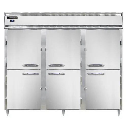 Unleash your inner chef with the Continental Refrigerator D3RENHD Reach-In Refrigerator. This designer line wide refrigerator is perfect for commercial restaurant use, offering a spacious 85-1/5" width and three sections to accommodate all your ingredients and supplies. The self-contained refrigeration system ensures optimal temperature control, while the aluminum exterior and interior provide durability and easy cleaning. The stainless steel front adds a sleek and professional look to your kitchen. The wide half-height stainless steel doors allow for easy access to your stored items, and the electronic control with digital display allows you to monitor and adjust the temperature with ease. With a hi-low alarm feature, you can rest assured that your perishable goods are always kept at the right temperature. The 6" stainless steel legs provide stability and make cleaning underneath a breeze. With a 1/2 HP motor, this refrigerator is powerful and efficient. Made in the USA and certified by cETLus and NSF, you can trust the quality and reliability of Continental Refrigerator. Upgrade your commercial kitchen with the Continental Refrigerator D3RENHD Reach-In Refrigerator and experience the convenience and efficiency it brings to your culinary endeavors.