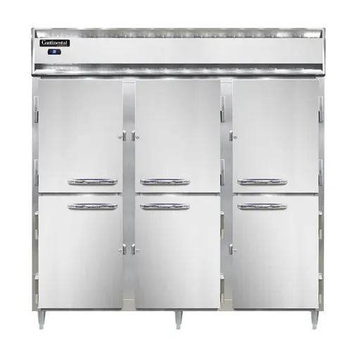 Mobilize your kitchen with the Continental Refrigerator D3RNHD Reach-In Refrigerator. This designer line refrigerator is perfect for commercial restaurant use, offering a spacious three-section layout to accommodate all your storage needs. The self-contained refrigeration system ensures optimal temperature control, while the aluminum exterior and interior provide durability and easy cleaning. The stainless steel front adds a sleek and professional touch to any kitchen. With half-height stainless steel doors, you can easily access your ingredients without compromising on energy efficiency. The electronic control with a digital display allows for precise temperature adjustments, and the hi-low alarm ensures that your perishable items are always kept at the right temperature. The 6" stainless steel legs provide stability and make cleaning underneath a breeze. With a 1/2 HP motor, this refrigerator is powerful enough to handle the demands of a busy commercial kitchen. Trust in the Continental Refrigerator D3RNHD to keep your ingredients fresh and your kitchen running smoothly. Made in the USA, this refrigerator is cETLus and NSF certified, guaranteeing its quality and reliability.
