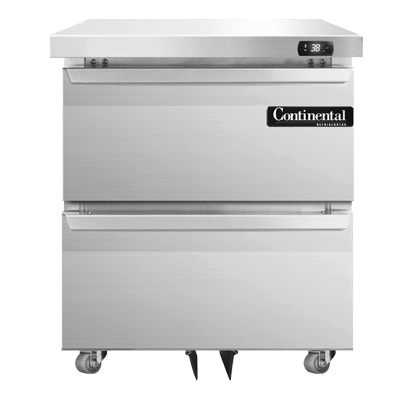 Revolutionize your cooking setup with the Continental Refrigerator SW27N-U-D Undercounter Reach-In Refrigerator. This top-of-the-line refrigerator is designed to meet the demands of a busy commercial restaurant kitchen. With a spacious 7.4 cu ft capacity and two drawers, it offers ample storage space for all your ingredients. Each drawer can accommodate a 12 x 20 x 6 pan, allowing for easy organization and access to your supplies. The stainless steel front, top, and end panels not only give this refrigerator a sleek and professional look, but also make it durable and easy to clean. The aluminum interior ensures optimal temperature retention, while the front breathing design and rear-mounted self-contained refrigeration system provide efficient cooling. The electronic control with digital display, hi-low alarm, and R290 Hydrocarbon refrigerant further enhance the functionality and energy efficiency of this unit. Made in the USA and certified by cETLus and NSF, the Continental Refrigerator SW27N-U-D is a reliable and high-quality addition to any commercial kitchen.