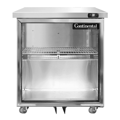 Equip your commercial kitchen with the Continental Refrigerator SW27NGD-U Undercounter Display Refrigerator. This one-section refrigerator is designed to meet the needs of busy restaurants, offering a spacious 7.4 cu ft capacity to store all your perishable ingredients. The glass door provides easy visibility, allowing you to quickly locate items without opening the door and letting cold air escape. The LED interior lighting further enhances visibility, ensuring that your ingredients are always easy to find. With its stainless steel front, top, and end panels, as well as an aluminum interior, this refrigerator is built to withstand the demands of a commercial kitchen. The front breathing design and rear-mounted self-contained refrigeration system ensure efficient cooling while minimizing noise. The electronic control with a digital display allows for precise temperature management, and the hi-low alarm alerts you if the temperature deviates from the set range. Made in the USA and certified by cETLus and NSF, this Continental Refrigerator is a reliable and high-quality addition to any commercial kitchen.